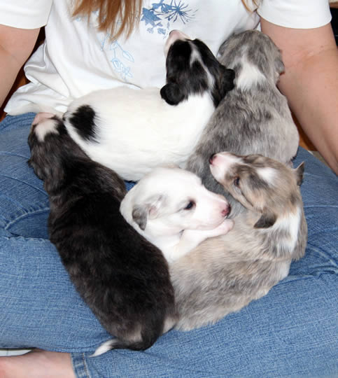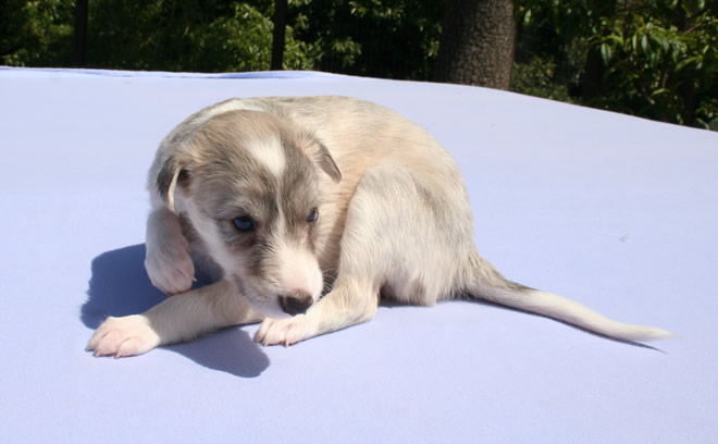 Superhero puppies at three weeks old are starting to play! Pigment is continuing to fill in and eyes are fully open and taking in everything. The babies are developing and getting stronger all the time. They enjoy climbing, crawling, along with very cute baby versions of walking and trotting. They seem to love spending time with their 'doggy' family, and Isis, Tuscan and Strider have all done their best to 'nurse' the babies, with extremely limited results at least as far as feeding is concerned. :)